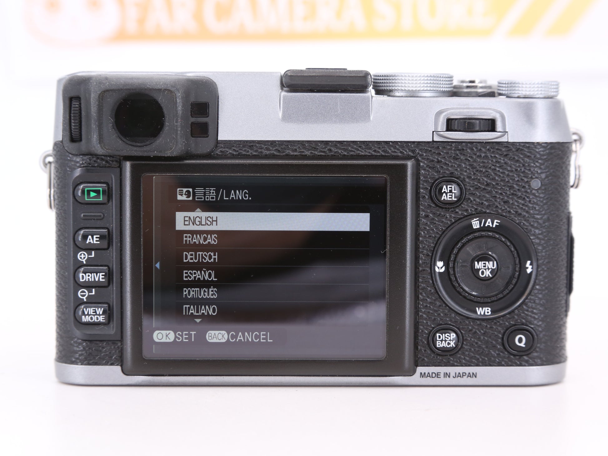 The camera's display language can be switched to multiple languages, including English.